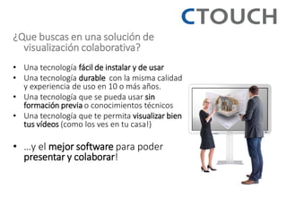 CTouch ofrece soluciones de software y hardware innovador para displays interactivos, destacándose por su fácil instalación, durabilidad y compatibilidad con múltiples sistemas operativos. La empresa proporciona opciones personalizables y adaptables para diferentes entornos, incluidos corporativos y educativos, asegurando una experiencia colaborativa de alta calidad. Sus productos son elegidos por marcas prestigiosas para eventos y comercios, ofreciendo tecnología avanzada como pantallas multitáctiles y soluciones de digital signage.