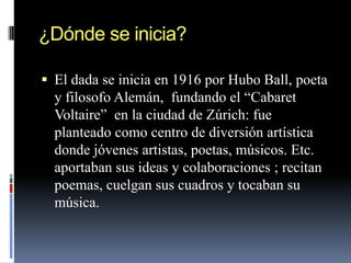 El dadaísmo se inició en 1916 en Zúrich cuando Hugo Ball fundó el Cabaret Voltaire, un centro de arte donde artistas como Tristán Tzara, Marcel Janco, Hans Arp, Man Ray, Marcel Duchamp y Francis Picabia presentaban poemas fonéticos, pinturas y música de forma espontánea. Algunos representantes clave desarrollaron el poema fonético (Ball), el objeto dada como gesto teatral (Picabia), y los ready-mades (Duchamp), aunque este último abandonó el movimiento en 1923.