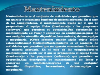 El mantenimiento de computadoras incluye actividades para mantener el hardware y software funcionando adecuadamente. El mantenimiento preventivo mantiene los componentes limpios y ejecuta programas de mantenimiento, mientras que el predictivo evalúa el estado de los componentes para programar mantenimiento solo cuando sea necesario. El mantenimiento correctivo repara o reemplaza componentes cuando se detectan fallas. Se requieren herramientas apropiadas como desarmadores y soldadura para el hardware, y actualizaciones de software para el software.
