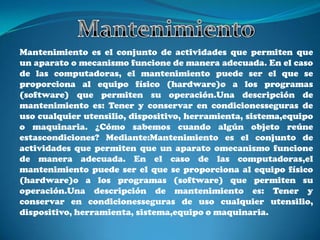 El mantenimiento consiste en realizar actividades para garantizar el funcionamiento adecuado de aparatos y mecanismos. En computadoras, el mantenimiento incluye tanto el equipo físico (hardware) como los programas (software). Existen tres tipos de mantenimiento: preventivo, predictivo y correctivo, cada uno con sus propias herramientas.