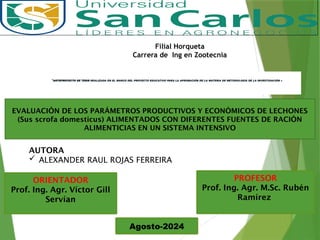 El documento presenta un anteproyecto de tesis que evalúa los parámetros productivos y económicos de lechones alimentados con diferentes fuentes de ración en un sistema intensivo en el distrito de Concepción. Se busca optimizar el rendimiento productivo y el costo económico de la producción porcina, considerando que la alimentación representa el 80% al 84% de los costos totales. La investigación incluye un diseño experimental y análisis estadístico para determinar la efectividad de las distintas raciones alimenticias.