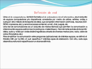 Una red de computadoras permite que equipos como computadoras, dispositivos y otros recursos compartan información y servicios al estar conectados a través de cables u otros métodos. Internet es la red más grande que conecta redes locales de todo el mundo, permitiendo el intercambio de grandes cantidades de información entre usuarios. El uso de Internet tiene aplicaciones importantes en campos como la educación, el transporte, la industria y la medicina, pero su acceso sigue siendo desigual entre países ricos y pobres.