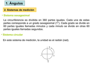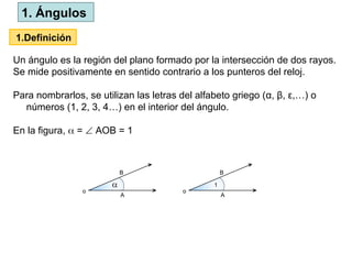 El documento define los ángulos como la región del plano formada por la intersección de dos rayos, y discute los sistemas de medición (sexagesimal y circular) para los ángulos. Se clasifica los ángulos según su medida y se presentan relaciones entre ángulos como complementarios, suplementarios y adyacentes. También se aborda la relación de ángulos opuestos por el vértice y ángulos formados entre líneas paralelas cortadas por una transversal.
