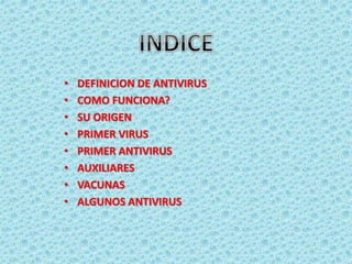 El documento presenta información sobre antivirus, incluyendo su definición, cómo funcionan, su origen y los primeros virus y antivirus. Explica que los antivirus comparan archivos con una base de datos de firmas de virus para detectarlos y que es importante mantener actualizadas estas firmas. También describe algunos antivirus comunes como Panda Security y características como detección heurística y protección contra spyware.