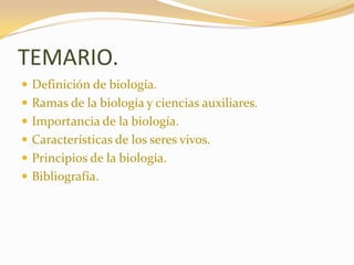 Este documento presenta una introducción a la biología. Define la biología como la ciencia de la vida y explica que estudia todos los aspectos relacionados con los organismos vivos, incluidos sus mecanismos internos, sus interacciones entre sí y con el medio ambiente. Luego enumera varias ramas principales de la biología como la botánica, zoología, ecología y genética. También destaca la importancia de la biología para comprender las enfermedades, los recursos alimenticios y el medio ambiente. Finalmente, resume