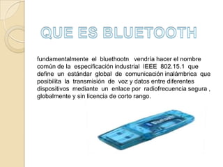 El documento describe la tecnología Bluetooth, incluyendo su historia, aplicaciones actuales y futuras, y especificaciones técnicas. Bluetooth fue desarrollado originalmente por Ericsson en 1994 para permitir la comunicación inalámbrica de bajo consumo entre dispositivos electrónicos como teléfonos móviles. En 1999, varias compañías formaron el Bluetooth SIG para estandarizar la tecnología. Actualmente, Bluetooth se usa comúnmente para conectar accesorios como auriculares y teclados a dispositivos electrónicos de manera inalá