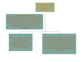 La civilización china se desarrolló originalmente cerca de los ríos Amarillo y Azul, donde sus suelos fértiles y paisajes naturales le permitieron progresar rápidamente. China adoptó un sistema político de monarquía absoluta bajo el emperador y varias dinastías, y su sociedad se caracterizó por una estricta jerarquía. Los chinos también hicieron importantes contribuciones a las artes, las ciencias, la agricultura y la tecnología.