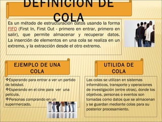 El documento describe las colas, incluyendo su definición, ejemplos de uso y diferentes implementaciones. Una cola es una estructura de datos que sigue el principio FIFO, donde los elementos se insertan en un extremo y se eliminan del otro. Se usan colas en sistemas informáticos, transporte y otras áreas para almacenar y procesar elementos de manera ordenada. Las colas pueden implementarse de forma estática usando arreglos o de forma dinámica permitiendo que su tamaño cambie.