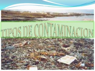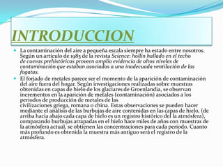 El documento describe brevemente la historia de la contaminación del aire a pequeña escala desde tiempos prehistóricos. También explica que la contaminación del aire fuera del hogar parece haber surgido con el forjado de metales, según muestras de glaciares. A continuación, define la contaminación y clasifica los diferentes tipos como de agua, aire, suelo, ruido, radiactiva, térmica, lumínica y visual.