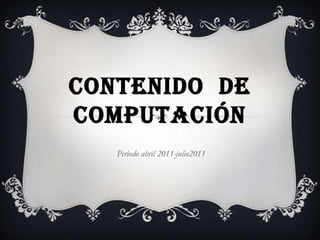 Este documento resume los contenidos de computación estudiados en dos bimestres. En el primer bimestre, se cubrieron conceptos fundamentales como hardware, software, sistema operativo, procesador de palabras y hoja de cálculo. En el segundo bimestre, los temas incluyeron ofimática web, correo electrónico, almacenamiento en la nube, marcadores, blogs, presentaciones en línea y licencias Creative Commons.
