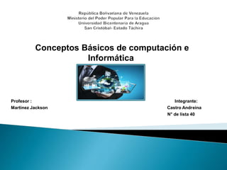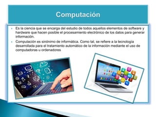 La informática se refiere al procesamiento automático de información mediante dispositivos electrónicos y sistemas computacionales. Un sistema computacional se compone de hardware y software que trabajan juntos para procesar datos e información. El hardware incluye dispositivos de entrada, procesamiento y almacenamiento, mientras que el software incluye sistemas operativos y programas de aplicación.