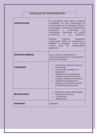 El documento presenta las justificaciones, objetivos generales, contenidos, metodologías y duraciones de 6 cursos de capacitación diferentes: Capacitación en Ofimática, Lenguaje de Programación, Base de Datos, Mantenimiento de Equipos y Redes. Los cursos buscan enseñar habilidades prácticas en software como Microsoft Office, lenguajes de programación, bases de datos en Access, y mantenimiento de equipos y redes a través de 20 horas de contenido en ambientes virtuales de aprendizaje y unidades didácticas.