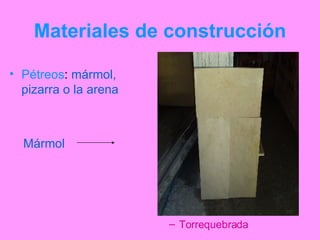 Este documento describe diferentes materiales de construcción como pétreos (mármol, pizarra, arena), cerámicos (ladrillos, tejas), vidrios, materiales aglutinantes (cemento, yeso), y compuestos (hormigón, asfalto). También discute propiedades como densidad, resistencia a la compresión y tracción de estos materiales. Explica que las cerámicas se obtienen de arcilla, feldespato y arena, y que los vidrios son transparentes, duros y resistentes a la corrosión.