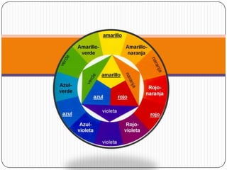 El documento describe las propiedades y significados simbólicos de los colores. Explica que los colores primarios son el rojo, amarillo y azul y que se pueden crear otros colores al mezclarlos. También distingue entre colores cálidos como el rojo y naranja, y colores fríos como el azul y verde. Cada color se asocia con diferentes emociones y mensajes.