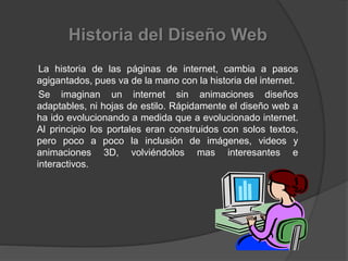 Este documento resume la historia del diseño web desde sus inicios hasta la actualidad. Comenzó con páginas de texto simples y ha evolucionado para incluir imágenes, videos, animaciones y diseños adaptables. Los primeros navegadores como Mosaic permitieron el acceso público a contenido en línea. Con el tiempo, las tecnologías como HTML, CSS y JavaScript han dado a los diseñadores más opciones para crear sitios web dinámicos e interactivos.