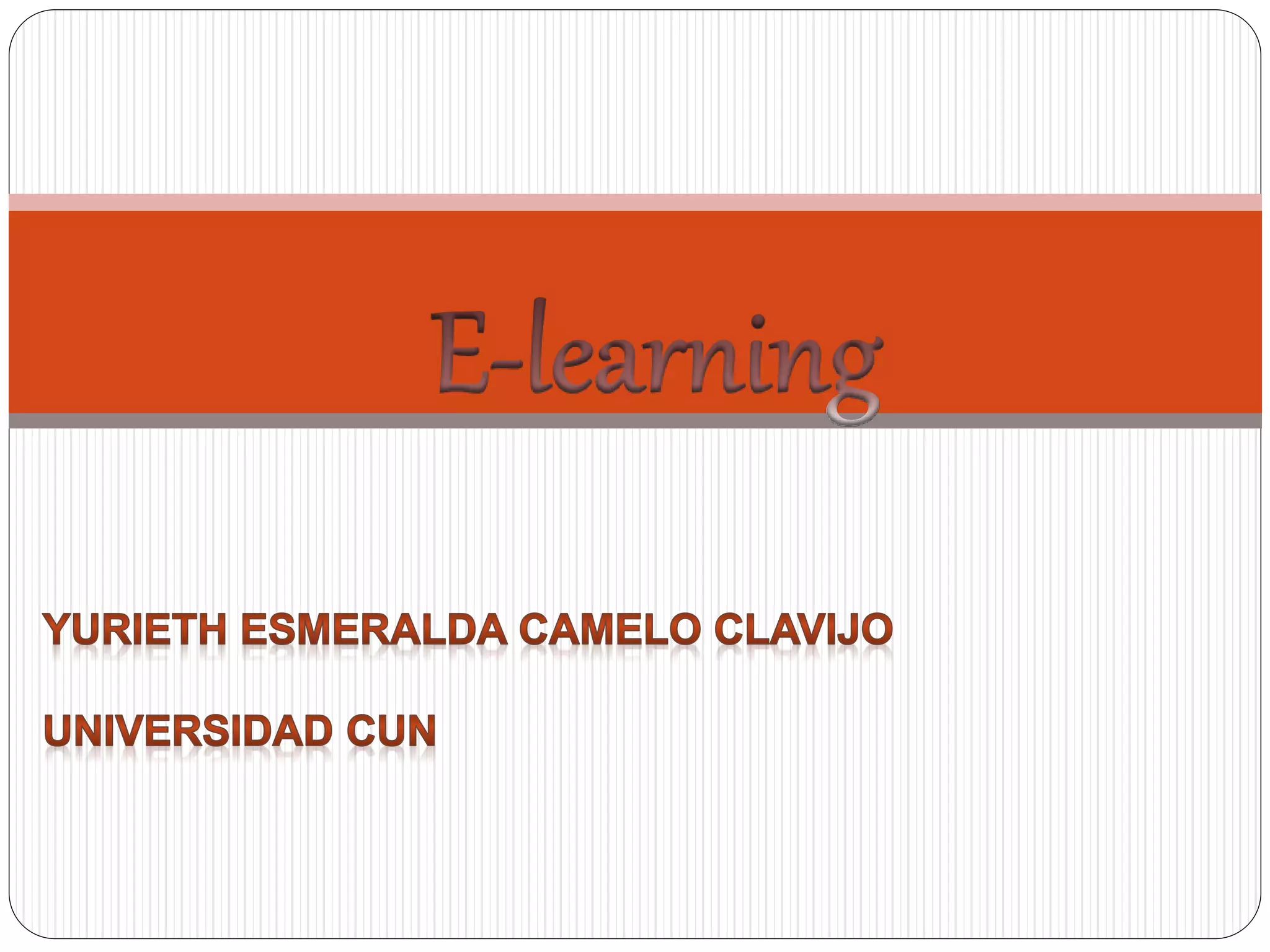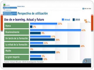 El documento describe las generalidades, ventajas, desventajas, herramientas y plataformas del e-learning. El e-learning es una metodología de educación virtual que integra tecnología y elementos pedagógicos para la enseñanza en línea. Ofrece acceso flexible a la educación desde cualquier lugar y ahorra costos, pero también puede enfrentar desafíos como falta de motivación o dependencia a la tecnología.