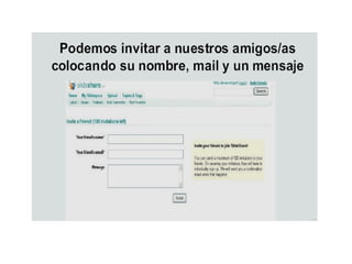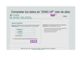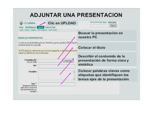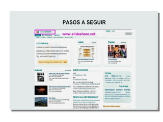 Slideshare es una aplicación web que permite a usuarios publicar presentaciones en línea como PowerPoint y OpenOffice, crear comunidades, y compartir presentaciones directamente en la web sin necesidad de adjuntar archivos. Para usar Slideshare, usuarios deben crear una cuenta, editar su perfil, cargar una presentación clasificada con etiquetas, publicarla, y difundirla o marcarla como favorita.