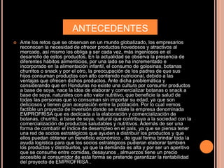 El documento presenta un proyecto para crear una empresa llamada EMPROFRISA dedicada a la elaboración y comercialización de botanas y snacks a base de soya y otros ingredientes naturales en Honduras. El proyecto busca aprovechar la demanda por snacks saludables y combatir el desempleo creando puestos de trabajo. La empresa ofrecería una variedad de snacks de soya y otros ingredientes como elote, guineos, malanga, mazapán, papas y plátano.