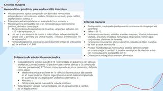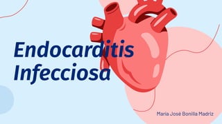 La endocarditis infecciosa es una infección potencialmente mortal de la superficie endocárdica del corazón, con un incremento en la incidencia asociada a la atención médica y edad avanzada. Los agentes etiológicos más comunes incluyen estreptococos, estafilococos y bacilos gramnegativos, y el diagnóstico se basa en hemocultivos, ecocardiografía y pruebas hematológicas. El tratamiento incluye terapia antimicrobiana específica y, en casos complicados, cirugía para reemplazo valvular, especialmente en infecciones resistentes o persistentes.