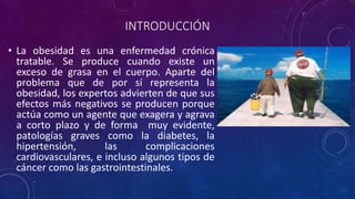 El documento habla sobre la obesidad como un problema de salud en México. Explica que la obesidad es una enfermedad crónica causada por un exceso de grasa corporal y factores como la genética, el metabolismo, el estilo de vida sedentario y el consumo excesivo de alimentos procesados. También menciona que en México, el 70% de la población sufre de sobrepeso u obesidad, siendo el estado de Sonora el primer lugar entre los estados fronterizos.