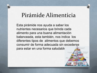 Este documento presenta información sobre los diferentes nutrientes necesarios para una alimentación balanceada, incluyendo proteínas, carbohidratos, grasas, vitaminas y minerales. Explica las funciones de cada nutriente, como las proteínas contráctiles que forman los músculos, los carbohidratos que sirven como fuente de energía, y las grasas que cumplen funciones energéticas y estructurales. También describe algunas vitaminas específicas como la A, B1 y C, y los alimentos en los que se pueden encontrar.