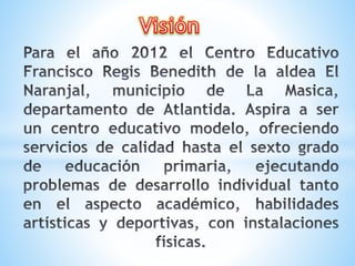 El documento resume los cambios en la matrícula y personal docente de la Escuela Francisco Regis Benedith en El Naranjal, Atlántida entre 2002 y 2004. En 2002 la matrícula aumentó a 187 alumnos e incorporaron 3 maestras. En 2003 la matrícula subió a 201 alumnos atendidos por 5 maestros, excepto uno que fue reemplazado. En 2004 se sumaron 2 maestras más.