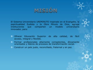 Este documento presenta el reglamento estudiantil de la Universidad Minuto de Dios. Describe los deberes y derechos de los estudiantes, incluyendo asistir a clases, pagar matrículas a tiempo, y abstenerse de consumir drogas o alcohol en la universidad. También cubre temas como el proceso de inscripción de cursos, consultar calificaciones, y cómo recuperar la contraseña en caso de olvidarla. El objetivo es definir las políticas y procedimientos que rigen la experiencia académica de los estudiantes