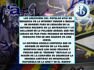 El documento presenta una serie de servicios y productos de Google como Google, creado a partir de la palabra "googol" que designa un número con cien ceros, Google Drive para almacenar archivos en la nube, Google Play para descargar aplicaciones en Android, Google+ para compartir contenidos, Google Calendar como agenda electrónica y Google Maps para visualizar mapas.