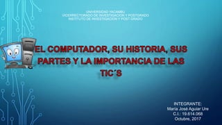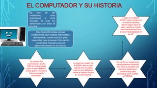 El documento describe la evolución de la computadora desde su creación en 1944 hasta la actualidad. Se mencionan hitos clave como la creación de la ENIAC en 1946, el desarrollo de los microprocesadores en los años 1970 y 1980, el surgimiento de Internet a mediados de los 1980, y el auge de las computadoras portátiles en los 1990. También se describen los principales componentes de una computadora y diferentes tipos de hardware y software.