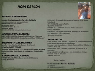 Paola Paredes presenta su hoja de vida, donde detalla su información personal y académica, así como su experiencia laboral manejando sistemas en el Banco Estudiantil y trabajando como secretaria en la Tenencia Política El Esfuerzo. También incluye referencias y sus logros escolares como primer escolta de la bandera.