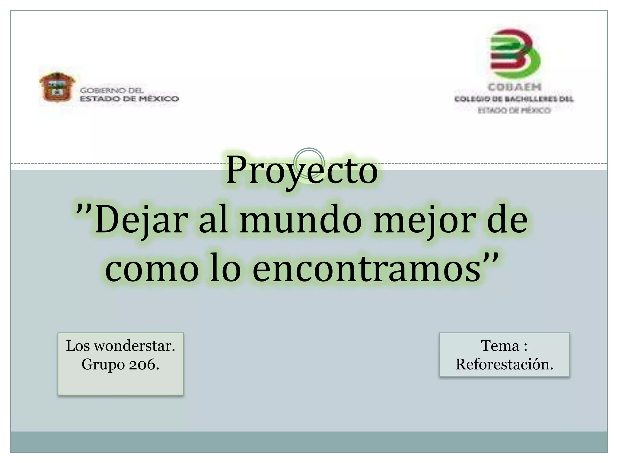 El proyecto consiste en reforestar un área de 7 metros cuadrados en la biblioteca y salón de usos múltiples de la escuela con 22 árboles de la especie Ficus las. Cada árbol estará separado por un metro y tendrá 50 cm de profundidad. Los estudiantes del grupo 206 se encargarán del cuidado de los árboles. El objetivo es reponer parte de los 1.5 millones de hectáreas que se deforestan anualmente en México y crear un jardín para promover la lectura.
