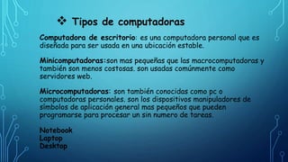 Este documento clasifica y describe diferentes tipos de computadoras. Las computadoras se clasifican según cómo procesan datos (digitales, analógicas o híbridas), su tamaño (macrocomputadoras, minicomputadoras o microcomputadoras) y su propósito (propósito específico o general). Las computadoras digitales procesan datos binarios, mientras que las analógicas procesan señales continuas. Las híbridas tienen características de ambas.