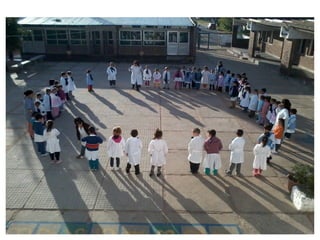 El documento describe una jornada de integración para estudiantes de primer año y maestras comunitarias. La jornada tuvo como objetivo familiarizar a los nuevos estudiantes con la institución y sus docentes. Las maestras Rosario Larroque y Lorena Cardozo organizaron diversas actividades para promover la integración de los participantes.