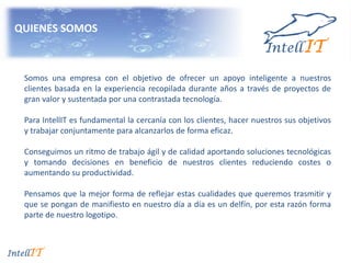 IntellIT es una empresa que ofrece servicios de tecnología e información a sus clientes, incluyendo seguridad de la información, firma electrónica y biométrica, desarrollo de software a medida y colaboración a través de perfiles externos. La empresa se enfoca en trabajar de cerca con los clientes para comprender y alcanzar sus objetivos de manera efectiva y reduciendo costos.