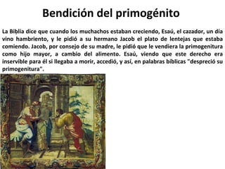 La historia bíblica cuenta que Jacob engañó a su hermano Esaú para robarle su bendición de primogénito. Más tarde, cuando Jacob regresaba a la tierra prometida, temía el encuentro con Esaú, quien había jurado matarlo, por lo que envió un mensaje pidiendo protección a Dios. Finalmente, los hermanos se reconciliaron.