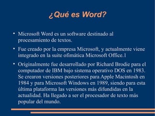Microsoft Word es un software de procesamiento de textos creado por Microsoft. Originalmente desarrollado en 1983, se convirtió en el procesador de texto más popular del mundo. Ha pasado por varias versiones para plataformas como DOS, Macintosh y Windows. Aunque tuvo dificultades iniciales para ganar popularidad, la versión para Windows de 1989 impulsó su éxito. Actualmente es el líder del mercado con cerca de 500 millones de usuarios.