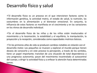 Este documento trata sobre el desarrollo físico y la salud en los primeros años de vida. Explica que el desarrollo físico depende de factores genéticos, motrices, de salud, nutrición y bienestar emocional. En los primeros años, los niños pasan de depender totalmente de otros a ser más autónomos a medida que desarrollan el control motor y la conciencia corporal. La intervención educativa debe fomentar estas capacidades y el conocimiento del propio cuerpo.