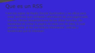 El documento explica qué es un RSS (Really Simple Syndication) y cómo permite a los usuarios acceder a la información actualizada de sus sitios favoritos sin visitar cada página. Describe diferentes tipos de lectores RSS, incluyendo aquellos que se instalan en el ordenador y lectores online, así como su funcionalidad. También menciona ejemplos de programas conocidos como FeedDemon, FeedReader y Google Reader.