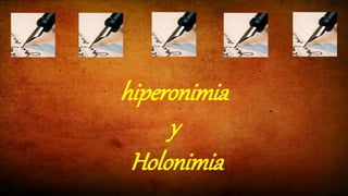 El documento define hiperonimia como una relación semántica entre términos donde un término más general (hiperónimo) puede referirse a un término más específico (hipónimo). También define holonimia como la relación entre un todo y sus partes, donde el todo (holónimo) incluye materialmente a las partes (merónimos). Proporciona ejemplos como "casa" que es el holónimo de partes como "dormitorio" y "comedor", y "carro" que tiene una relación holonímica con el "