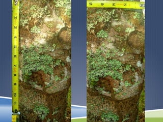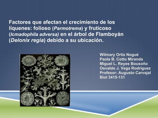 El resumen analiza cómo la ubicación de los árboles de Flamboyán afecta el crecimiento de dos tipos de líquenes. Los árboles más cercanos a la carretera oeste tenían una mayor cantidad de líquenes foliosos (Parmotrema) y fruticosos (Icmadophila adversa) que los árboles más alejados. Esto confirma la hipótesis de que la ubicación del árbol determina el crecimiento de los líquenes.