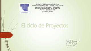 El documento proporciona información sobre una persona llamada Luis A. Paredes S. que asiste a la Escuela # 75 y está afiliada al Instituto Universitario de Tecnología "Antonio José de Sucre" en Mérida, Venezuela que forma parte del Ministerio del Poder Popular para la Educación Universitaria de Ciencias y Tecnología de la República Bolivariana de Venezuela.