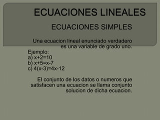 Una ecuación lineal enunciado verdadero es una variable de grado uno. Ejemplos incluyen x+2=10, x+5=x-7 y 4(x-3)=4x-12. El conjunto de los datos o números que satisfacen una ecuación se llama conjunto solución de dicha ecuación.