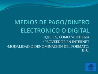 Este documento presenta información sobre diferentes temas y métodos de pago electrónicos y digitales para el comercio electrónico. Explica conceptos como tarjetas de débito y crédito, billeteras virtuales, transferencias bancarias online, cheques electrónicos, tarjetas virtuales y monederos electrónicos. También describe cómo funcionan los pagos online a través de tarjetas de crédito y proveedores de servicios de pago como CyberCash.