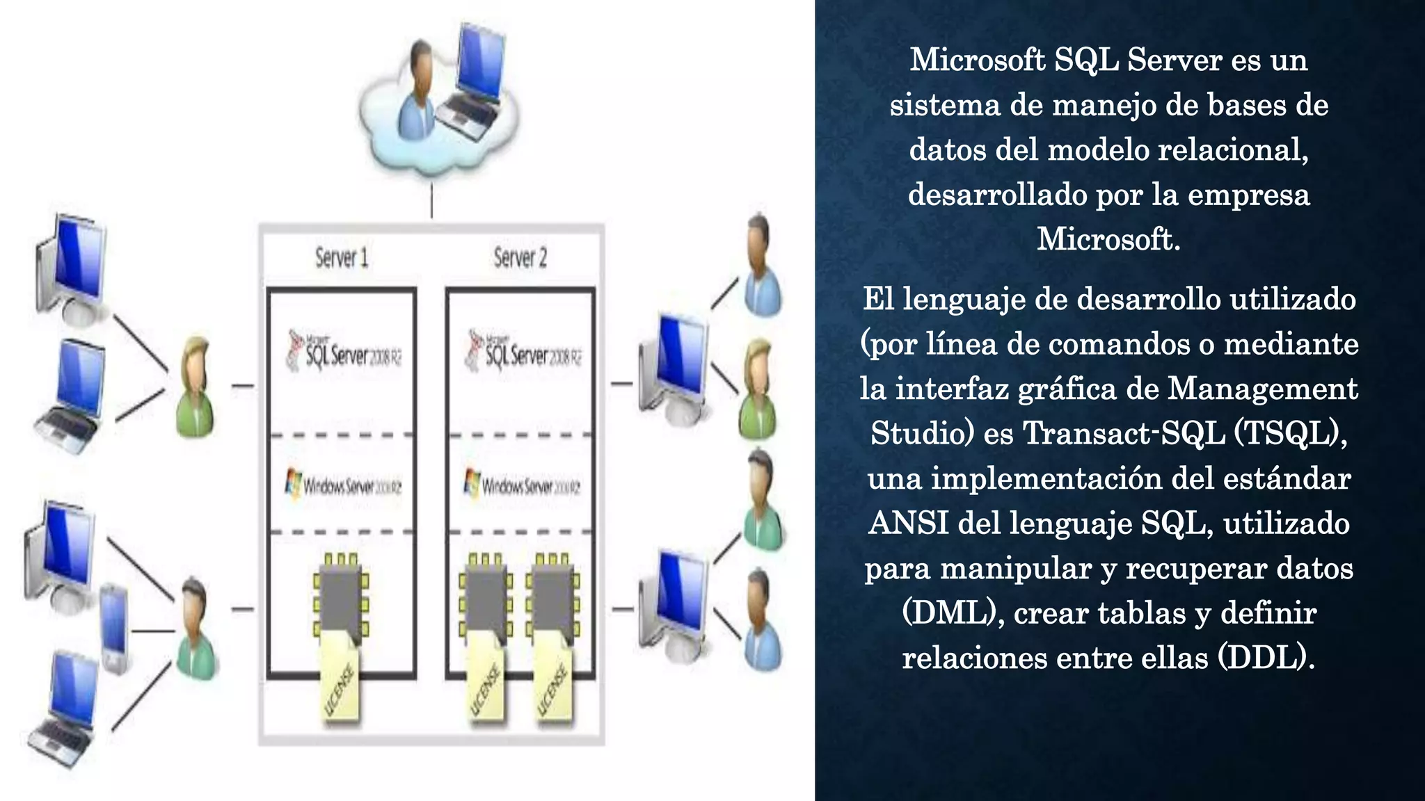 Microsoft SQL Server es un sistema de gestión de bases de datos relacional desarrollado por Microsoft, utilizando Transact-SQL para la manipulación de datos. Desde su lanzamiento inicial en 1989, ha evolucionado a través de varias versiones, mejorando sus características como soporte de transacciones y administración gráfica. Entre sus ventajas se incluyen la capacidad de gestionar bases de datos en red y definir funciones personalizadas, aunque presenta desventajas como alto uso de memoria y restricciones en su utilización.