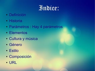 Este documento resume conceptos clave de la música como su definición, historia, parámetros, elementos, cultura, géneros, estilos y composición. Explora la evolución de la música desde la antigua Grecia y destaca cuatro parámetros fundamentales del sonido: altura, duración, intensidad y timbre.
