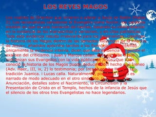 El documento explora la historia de la Navidad y su significado cristiano, destacando la llegada de los 'sabios de oriente' para adorar a Jesús y cómo la iglesia adaptó la celebración a partir de festividades paganas. También presenta la perspectiva de un niño pobre que, al conocer el significado de la Navidad, se da cuenta de que es una celebración inclusiva, no solo para los ricos, y reflexiona sobre el verdadero significado de dar amor a los menos afortunados. Finalmente, se menciona la figura de Santa Claus, un personaje que combina mitología solar con la tradición cristiana de San Nicolás.