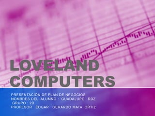 Este documento presenta el plan de negocios de Loveland Computers. Los objetivos son mantener bajos precios para ser competitivos frente a IBM y Apple. Actualmente es una de las principales tiendas de venta por correo a nivel nacional. El plan describe la competencia, equipo, ventas trimestrales, oportunidades, concepto de negocio, metas, plan financiero, necesidades de recursos, riesgos y beneficios, y temas clave como el crecimiento de ventas a corto y largo plazo. Se propone una financiación exter
