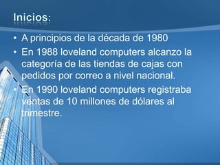 El documento describe el crecimiento de Loveland Computers desde principios de la década de 1980 hasta 1990, cuando registró ventas trimestrales de 10 millones de dólares. Para satisfacer las necesidades de los clientes y ofrecer los mejores precios sin afectar la calidad, la empresa contrató a una ingeniera para ayudar con las especificaciones técnicas de las máquinas. Las ventas crecieron rápidamente debido a que los modelos se volvían obsoletos cada seis meses, lo que llevó a Loveland Computers a cre