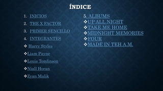 One Direction se formó en 2010 en el programa de televisión The X Factor en el Reino Unido. El grupo lanzó 5 álbumes de estudio entre 2011 y 2015 que tuvieron gran éxito comercial. Originalmente el grupo estaba compuesto por 5 integrantes, pero en 2015 el miembro Zayn Malik dejó el grupo, dejándolo con solo 4 integrantes.