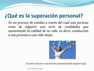 El documento habla sobre la superación personal y cómo es un proceso de cambio para adquirir cualidades que mejoren la calidad de vida de una persona. Este proceso implica liberarse de creencias erróneas y enfrentar la vida desde una nueva perspectiva. Lograr la superación personal requiere convertirse en una persona diferente a través de tácticas como explorar los pensamientos a través de la escritura y entender los catalizadores del estado de ánimo.